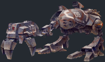 Tanque articulado terrestre de la seguridad policial que patrulla a las afueras de la ciudad. DRACHE representa dragón eso es debido al cuello de dragón que forma su brazo mecánico articulado.
